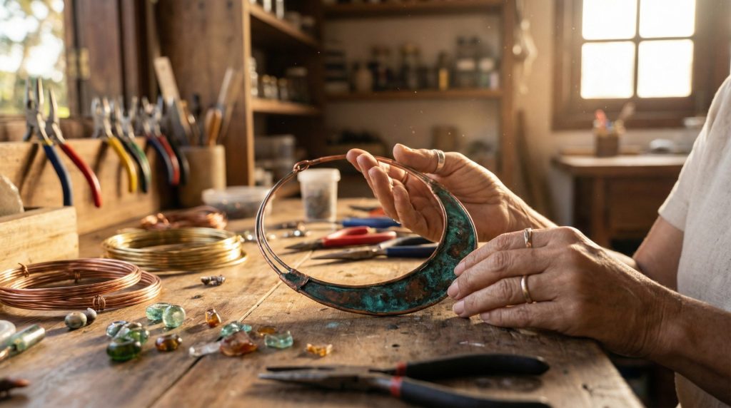 Para quem busca exclusividade, a resina epóxi permite eternizar flores secas, glitters e pequenos objetos dentro de pingentes, criando peças únicas que não podem ser replicadas industrialmente. Paralelamente, a técnica de arame (wire wrapping) permite esculpir o metal em volta de pedras brutas, criando anéis e pingentes orgânicos que são verdadeiras esculturas vestíveis.