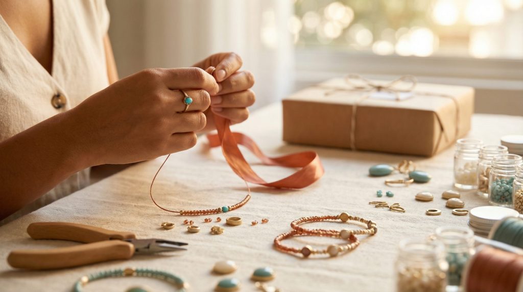 Uma estratégia eficaz para aumentar o ticket médio das vendas é a criação de kits. Em vez de vender apenas uma pulseira, ofereça um “stack” (conjunto) de três pulseiras que combinam entre si. Kits de “Monte sua Biju” para crianças ou para presentear pessoas criativas também são excelentes opções. A embalagem (unboxing) faz toda a diferença: cartões de agradecimento, saquinhos de organza ou caixas personalizadas agregam valor e tornam a experiência de compra memorável.