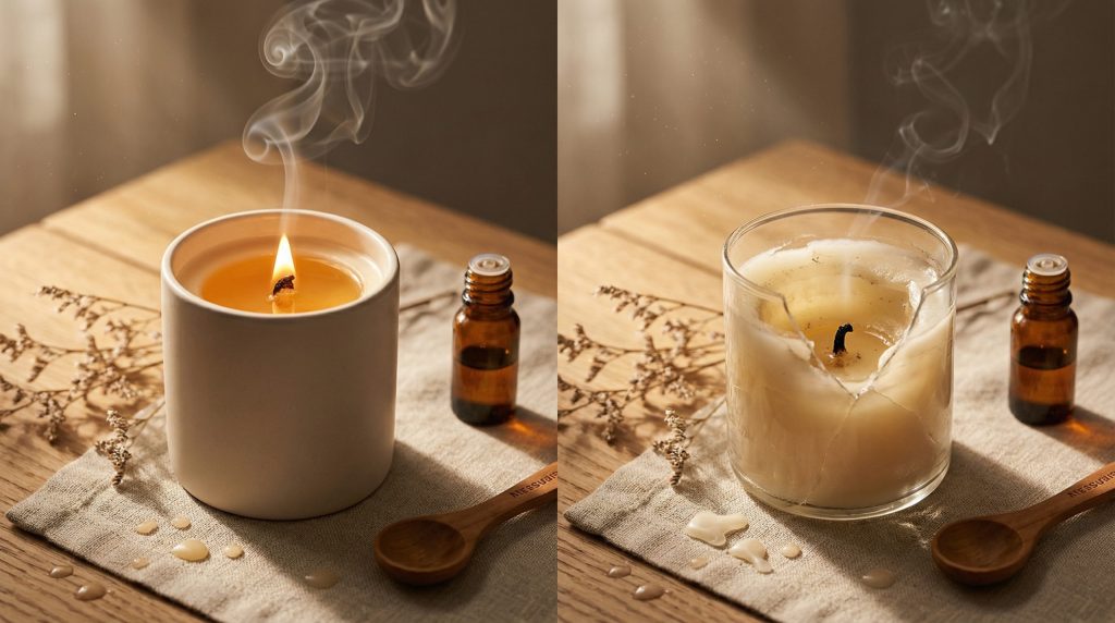- Aquecimento do Recipiente: Em dias frios, aqueça levemente o vidro antes de despejar a cera para evitar choque térmico.